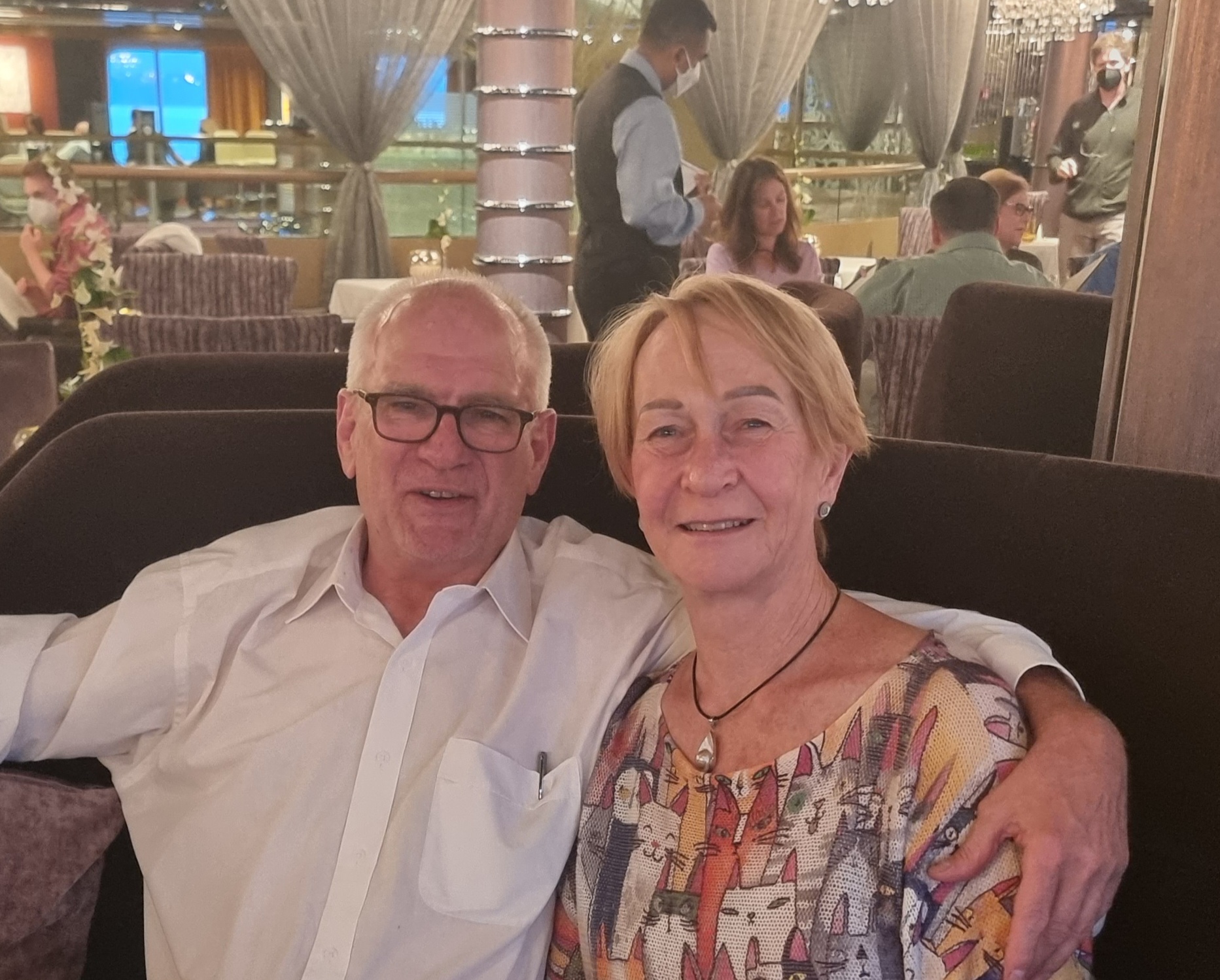 Boarding went smoothly. Went to cabin, Allans bag was there but Wendy’s wasn’t. Finally turned up after about 90minutes. Wendy had a large bottle of Listerine in the bag and they must have thought it was alcohol.